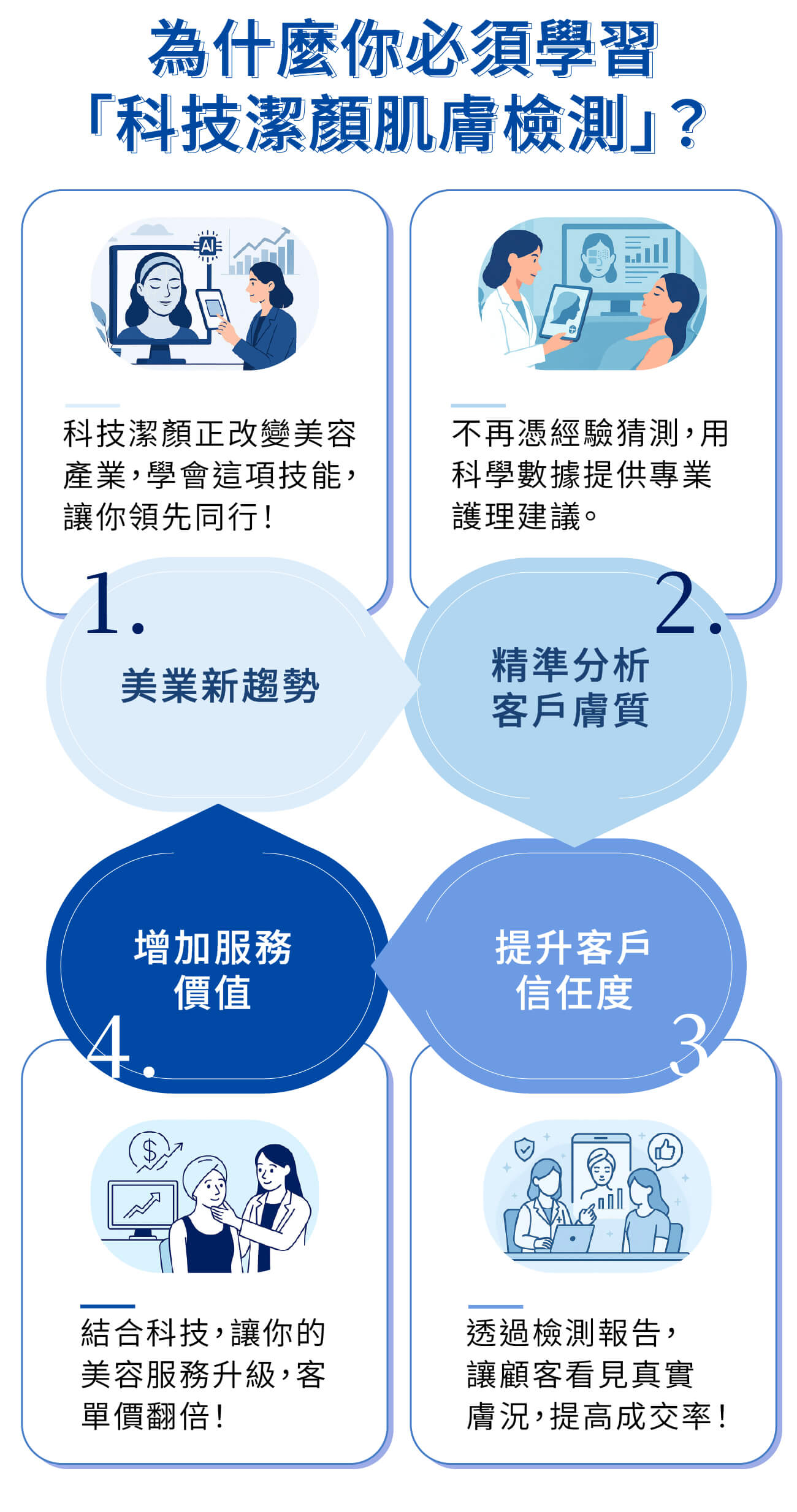- 如何根據皮膚護理的需求調整服務流程與儀器使用