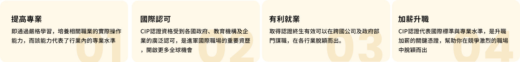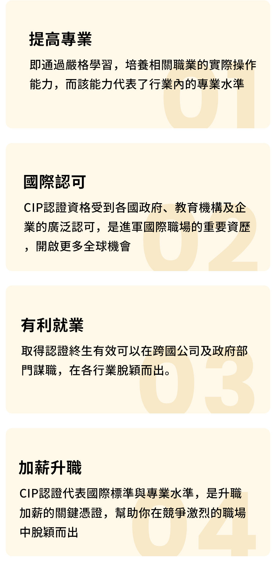 CIP單位全稱為「國際職業認證管理協會(Certified-International Professional ManagementAssoci-ation」,與一般證照的差異在於CIP認證的是職業能力,具有教學力與就業力認證,國際證免重考。