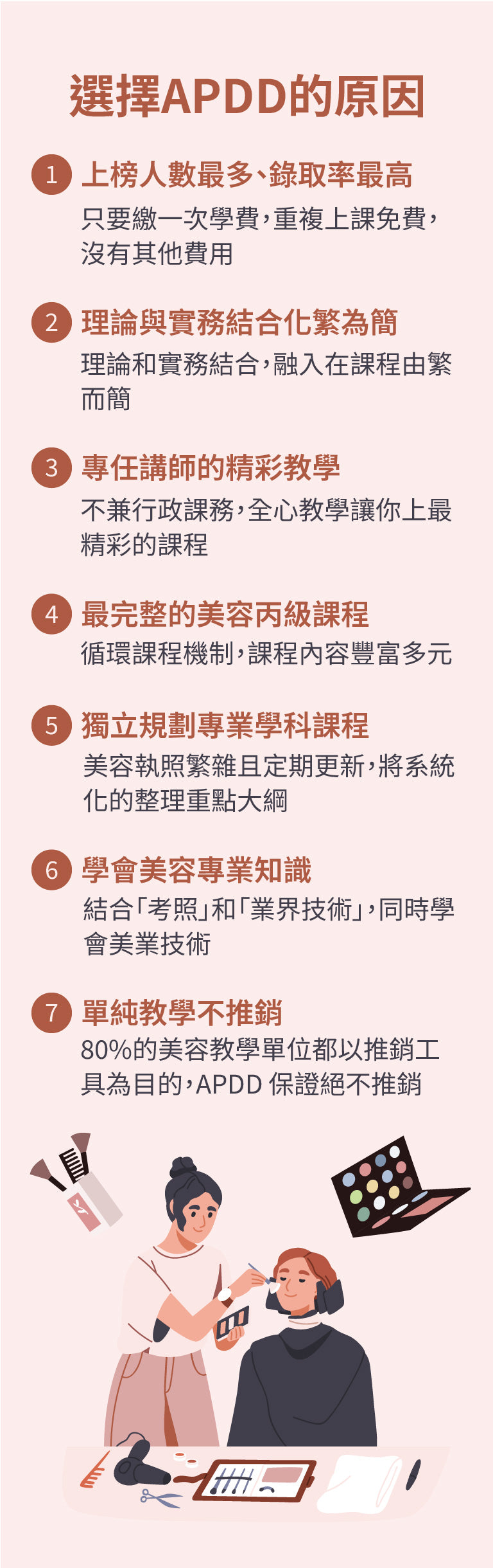 美容丙證是踏入美業第一步,我們不用譁眾取寵的低廉價格讓妳來報名,再灌水收取非必需指定材料費或以各種名目額外多酌收其他非必要的費用,人才的培養並不廉價,而廉價的絕對是學而無用,我們的保證考取是需要經過妳專心聽課、認真學習取得,這是協會與老師們的初衷,願每個加入美麗行業的你們都擁有紮實的基礎