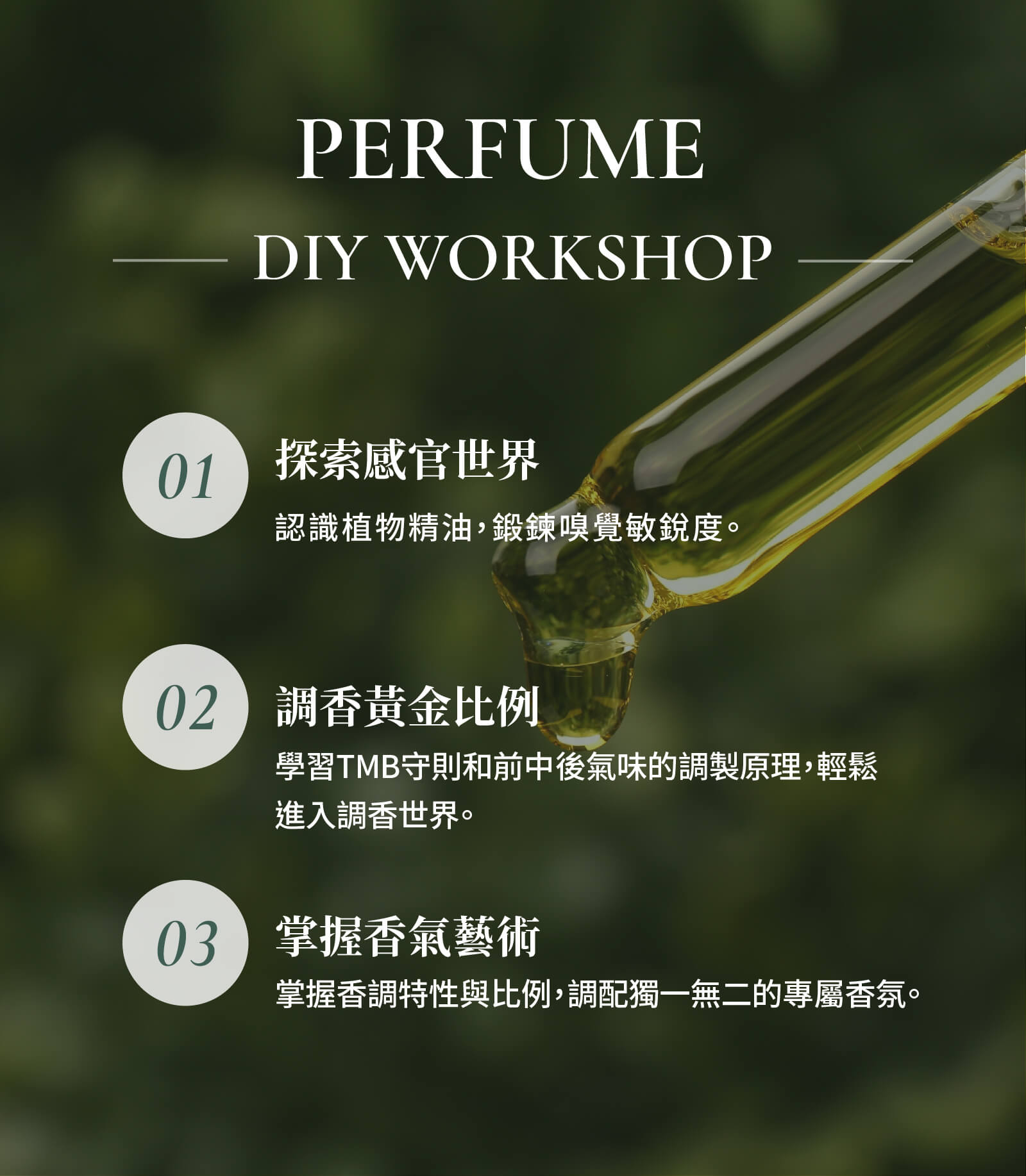純精油DIY香水課程,透過簡單易學的TMB調香法,帶您掌握前中後味的完美比例,打造專屬香氛,結合嗅覺藝術與個人記憶,創作出獨一無二的迷人氣息